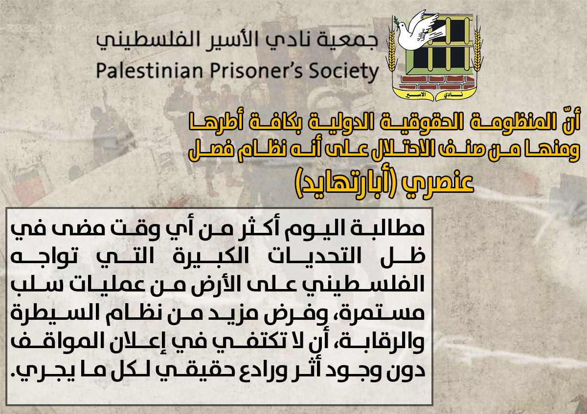 👈وأضاف نادي الأسير أنّ المنظومة الحقوقية الدولية بكافة أطرها ومنها من صنف الاحتلال على أنه نظام فصل عنصري (أبارتهايد)، مطالبة اليوم أكثر من أي وقت مضى في ظل التحديات الكبيرة التي تواجه الفلسطيني على الأرض من عمليات سلب مستمرة، وفرض مزيد من نظام السيطرة والرقابة، أن لا تكتفي في إعلان المواقف دون وجود أثر ورادع حقيقي لكل ما يجري.