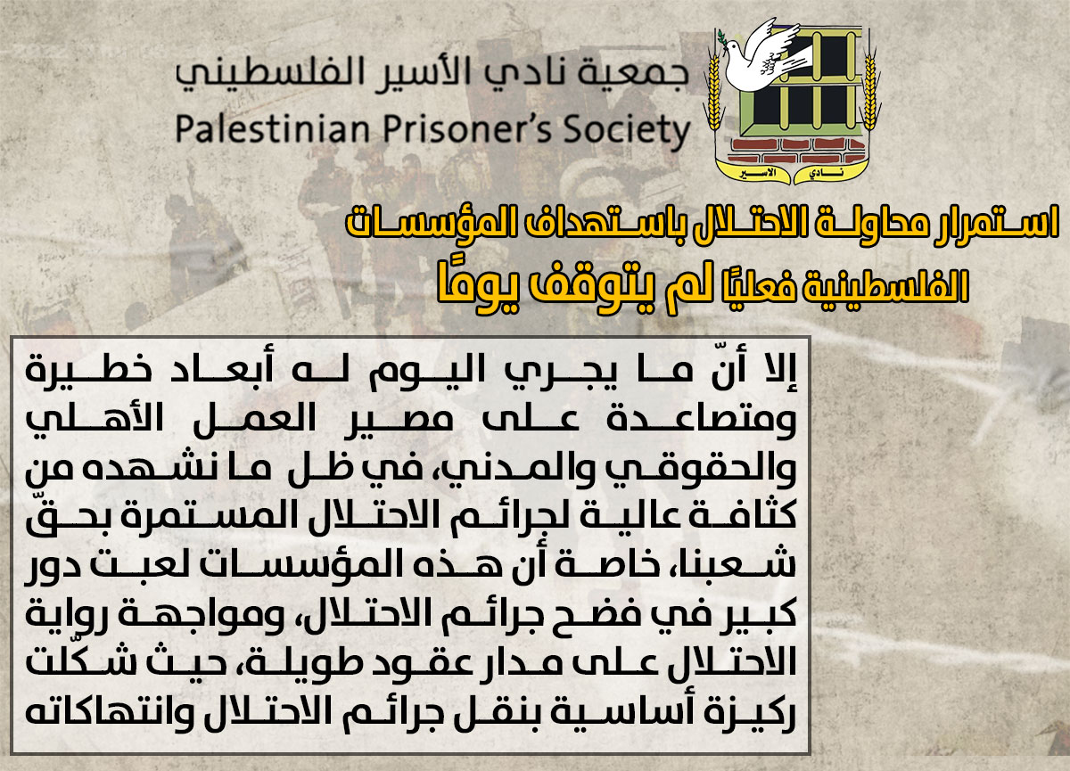 👈وتابع نادي الأسير إنّ محاولة الاحتلال باستهداف المؤسسات الفلسطينية فعليًا لم يتوقف يومًا إلا أنّ ما يجري اليوم له أبعاد خطيرة ومتصاعدة، على مصير العمل الأهلي والحقوقي والمدني، في ظل ما نشهده من كثافة عالية لجرائم الاحتلال المستمرة بحقّ شعبنا، خاصة أن هذه المؤسسات لعبت دور كبير في فضح جرائم الاحتلال، ومواجهة رواية الاحتلال على مدار عقود طويلة، حيث شكّلت ركيزة أساسية بنقل جرائم الاحتلال وانتهاكاته.