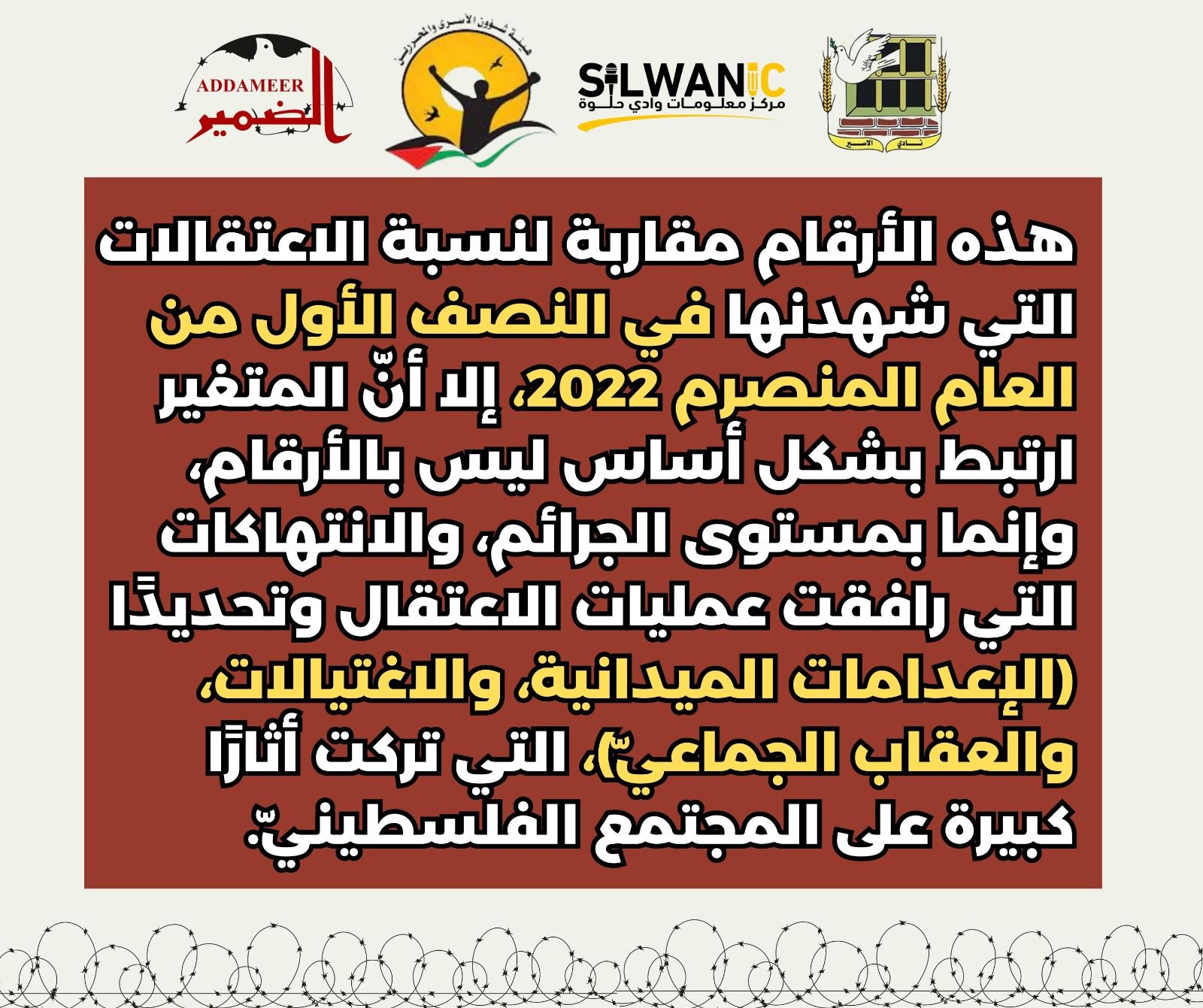 تؤكد مؤسسات الأسرى (هيئة شؤون الأسرى والمحررين، ونادي الأسير الفلسطيني، ومؤسسة الضمير لرعاية الأسير وحقوق الإنسان، ومركز معلومات وادي حلوة – القدس)، أنّ هذه الأرقام مقاربة لنسبة الاعتقالات التي شهدناها في النصف الأول من العام المنصرم 2022، إلا أنّ المتغير ارتبط بشكل أساس ليس بطبيعة الأرقام، وإنما بمستوى الجرائم، والانتهاكات التي رافقت عمليات الاعتقال وتحديدًا (الإعدامات الميدانية، والاغتيالات، والعقاب الجماعيّ)، التي تركت آثارًا كبيرة على المجتمع الفلسطينيّ، فيما كان المتغير الأبرز في هذه الأرقام، المتعلقة بمستوى أعداد أوامر الاعتقال الإداريّ، حيث بلغت هذا العام 2023 كما ذكرنا أعلاه (1608)، بينما كان عددها في النصف الأول من العام المنصرم 2022، (862).
