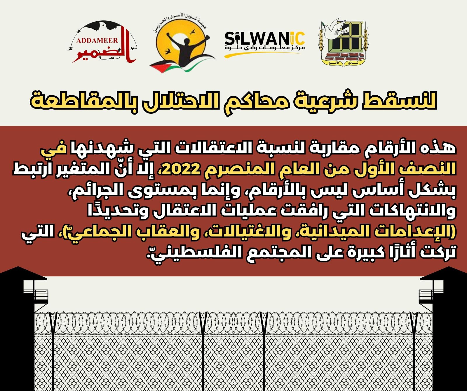 ودعوة المؤسسات إلى إعادة تقييم التعاطي مع الجهاز القضائي للاحتلال، الذي كان وما زال أداة أساسية في ترسيخ الجرائم ضد المعتقلين والأسرى، إلا أنّ الإمعان في ذلك تصاعد بشكلٍ لافت في السنوات القليلة الماضية، وتحديدًا في هذا العام مع وجود حكومة يمينية فاشية، وذلك من خلال المتابعات التي أجرتها المؤسسات، ومن خلال قراءة المئات من قرارات هذه المحاكم التي تؤكد أنها تنفّذ قرارات سياسية، وتحديدًا قضية الاعتقال الإداري الشاهد الأبرز على صورية محكمة الاحتلال. ودعوتنا هذه تحت شعار (لنسقط شرعية محاكم الاحتلال بالمقاطعة).