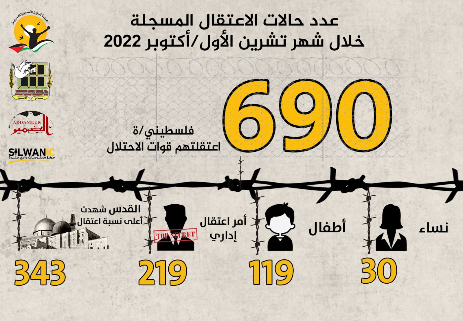 مؤسسات الأسرى: الاحتلال اعتقل (690) فلسطينياً خلال شهر تشرين الأول/أكتوبر 2022