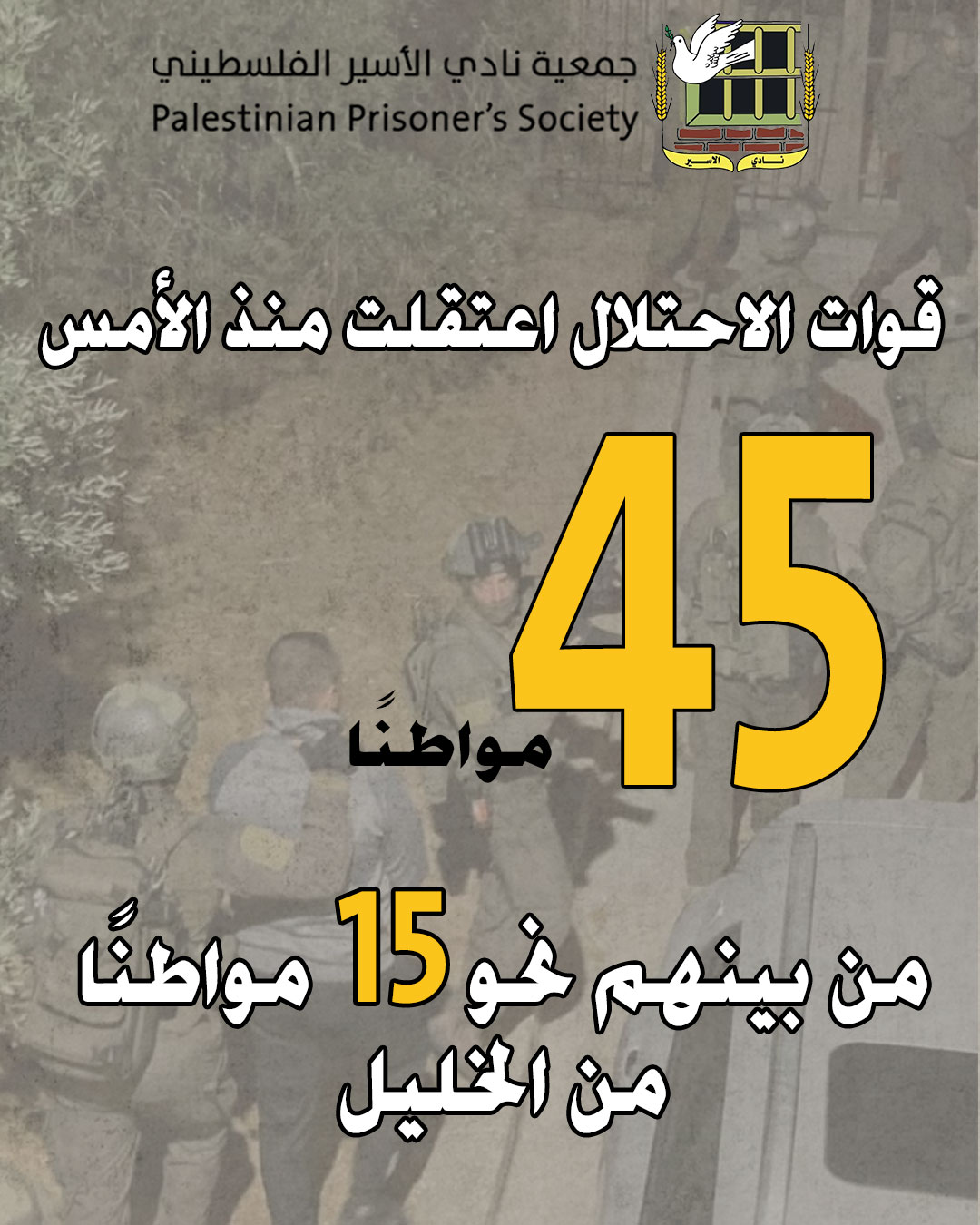 نادي الأسير: قوات الاحتلال اعتقلت منذ الأمس 45 مواطنًا من الضّفة من بينهم نحو 15 من الخليل