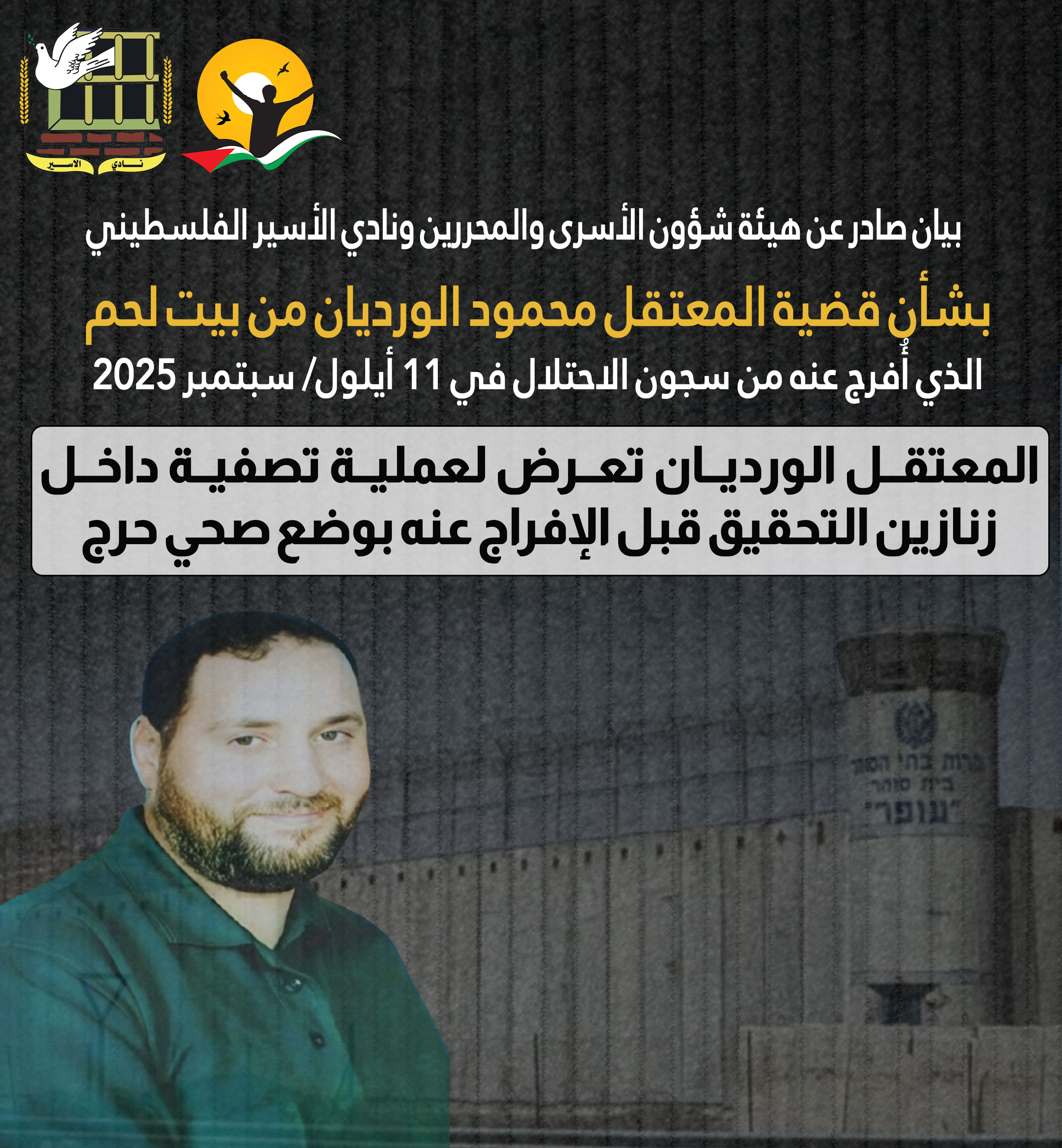 ⭕ صادر عن هيئة شؤون الأسرى والمحررين ونادي الأسير الفلسطيني بشأن قضية المعتقل محمود الورديان من بيت لحم، الذي أُفرج عنه من سجون الاحتلال في 11 أيلول/ سبتمبر 2025